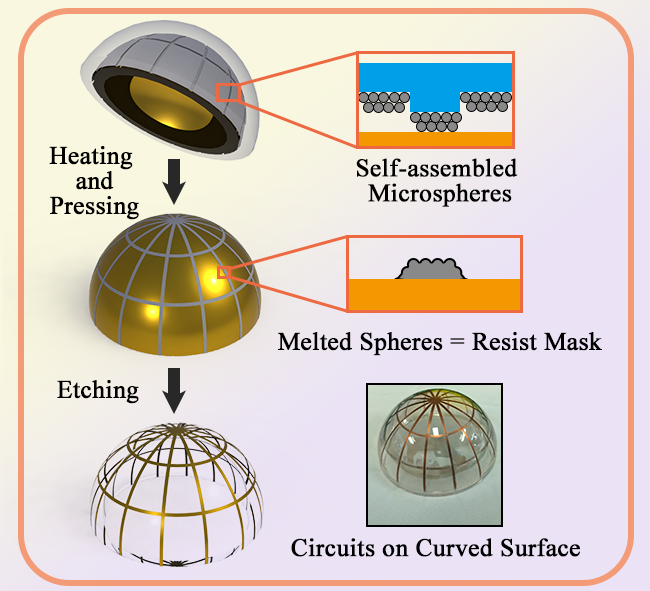 在智能穿戴、仿生电子等前沿领域,如何让电路像“皮肤”一样贴合复杂曲面,一直是制约技术发展的关键瓶颈。近日,清华大学高端装备界面科学与技术全国重点实验室生医装备团队在高精度曲面微纳制造领域取得突破性进展,提出一种全新的“图案化掩膜转印光刻”技术,成功在复杂曲面上高效、高精度制备微米级图案。这项成果以“基于自组装涂层的任意曲面图案化掩膜转印光刻技术”(Stamping Lithography on Arbitrary Surfaces based on Self-Assembly of Colloidal Particles)为题,发表于《Advanced Science》,为未来三维曲面电子器件的规模化制造提供了一种全新的可行路径。