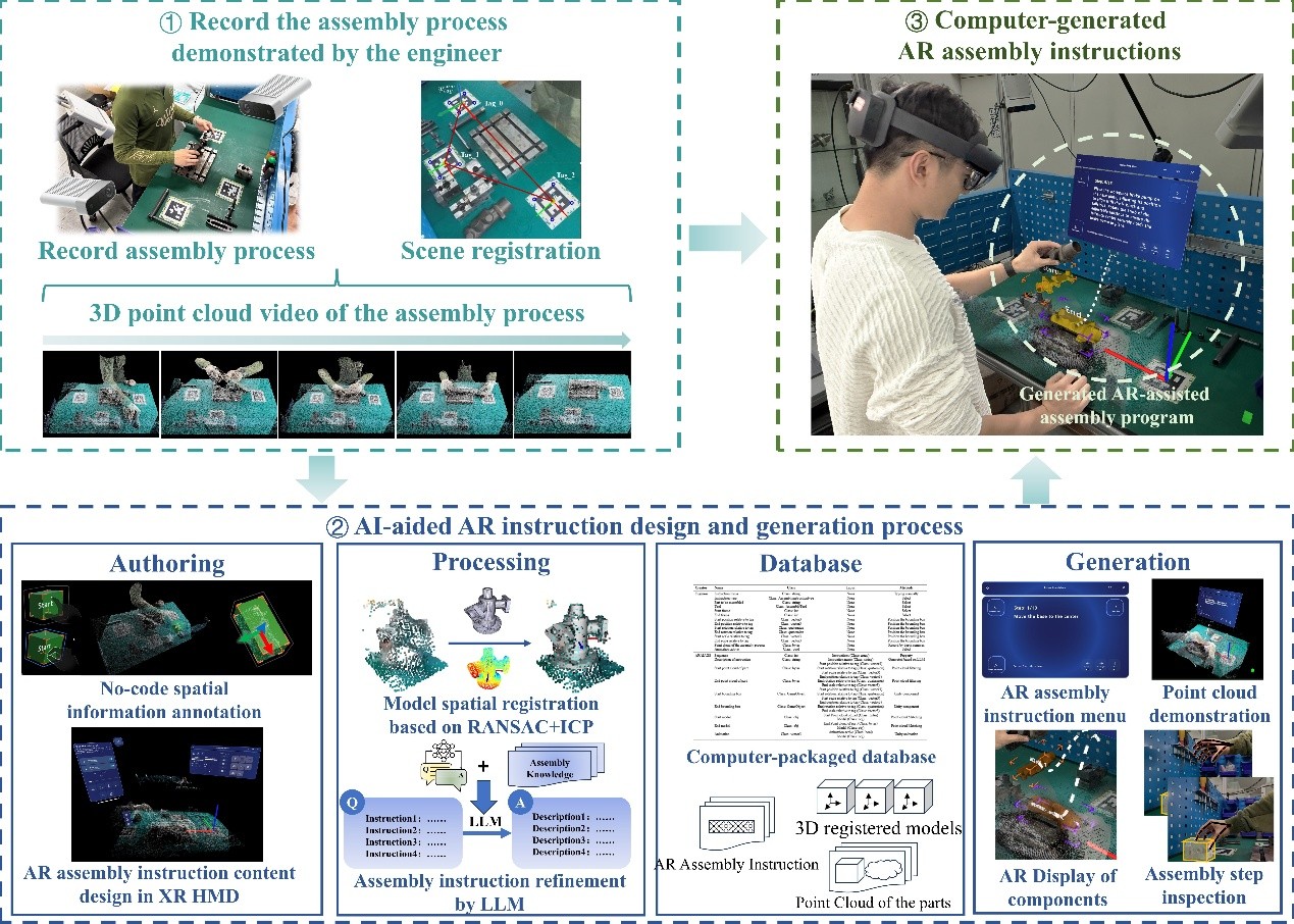 近日,清华大学高端装备界面科学与技术全国重点实验室智能制造与精密加工团队提出了一种人工智能辅助的增强现实辅助装配指令创作与生成方法(ARAIAG),为高混合制造环境下的增强现实装配引导及程序智能生成提供了创新解决方案。研究成果以"AI-aided Automated AR-Assisted Assembly Instruction Authoring and Generation method"为题,发表于《Journal of Manufacturing Systems》期刊。论文第一作者为清华大学机械工程系博士生林君健,通讯作者为张建富长聘教授,论文作者还包括王健健副教授、冯平法教授、张翔宇助理研究员和郁鼎文教授。